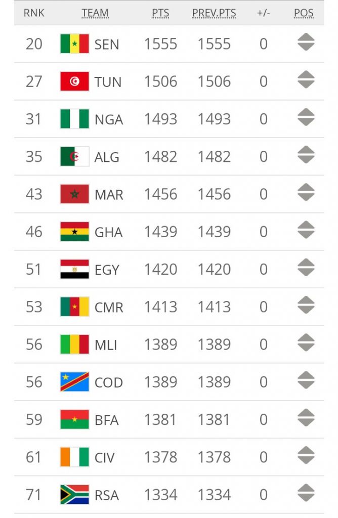 Senegal since their emergence as Champions of Africa after winning the 2019 African Cup of Nations, retains its twentieth place with 1555 points. The Lions are ahead of Tunisia (second with 1,506 points) and Nigeria (third with 1,493). Aliou Cisse’s men have not lost their first place in Africa since November 2018.