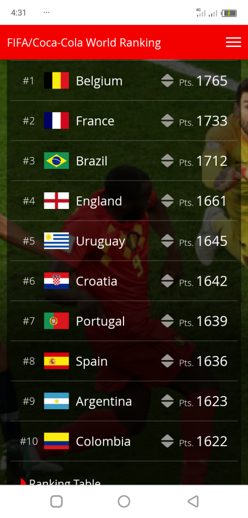 Belgium therefore remains on its throne in front of France and Brazil, which completes the podium. Next are England and Uruguay, still positioned in 4th and 5th row respectively. Behind, in order, Croatia, Portugal, Spain, Argentina and Colombia are in ambush.